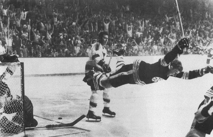 - the picture above shows Bobby Orr, number 4, scoring the fourth goal, during the fourth period (overtime), of the fourth game of the 1972 Stanley Cup playoffs. This goal won the series. He was tripped by player number 4